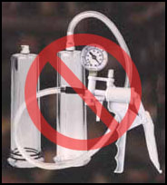 真空吸器:各個年齡層都可見使用真空吸器,然而你知道有誰在用過它們後真的有成果的嗎?真空幫浦的主要概念是強迫血液進入陰莖內,迫使陰莖變大。表面上看來沒什麼問題,甚至可能和我們在網路課程計劃中解釋的某些部分有一致性。總之,在使用任何類似真空吸器之前請三思,因為副作用和事件反應會相當嚴重!